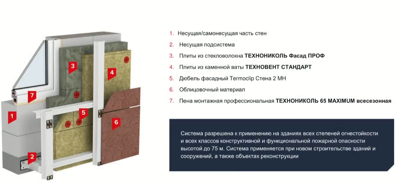 Паропроницаемость - это базовое условие для мембраны в конструкции навесного вентфасада. Применение материалов с повышенным сопротивлением паропроницанию или паронепроницаемых мембран может привести к переувлажнению конструкции. Группа горючести - не выше Г1.