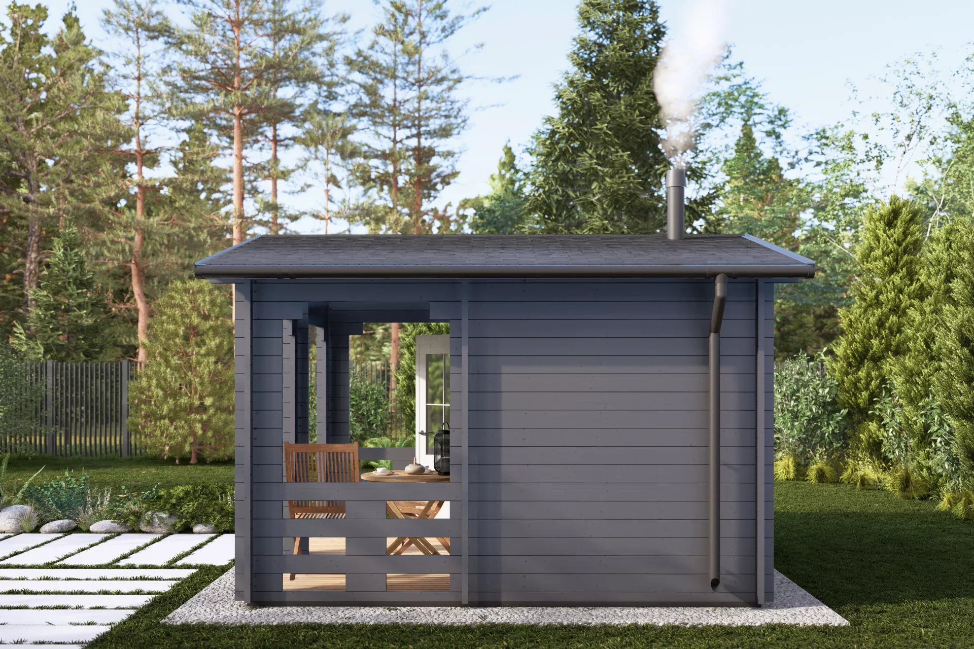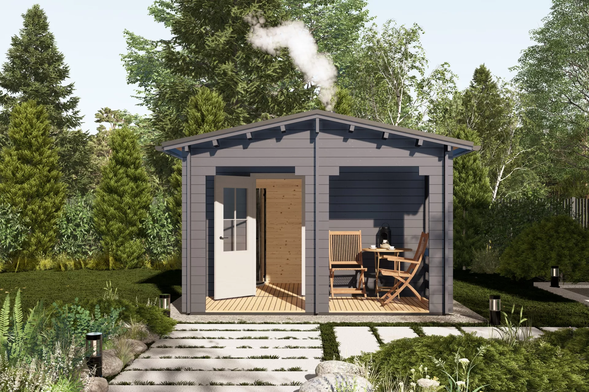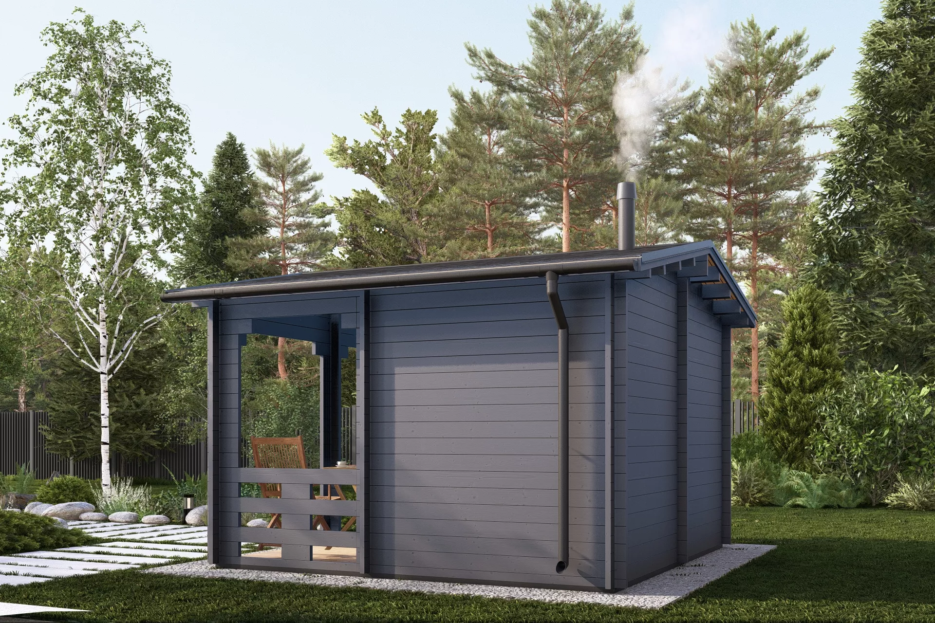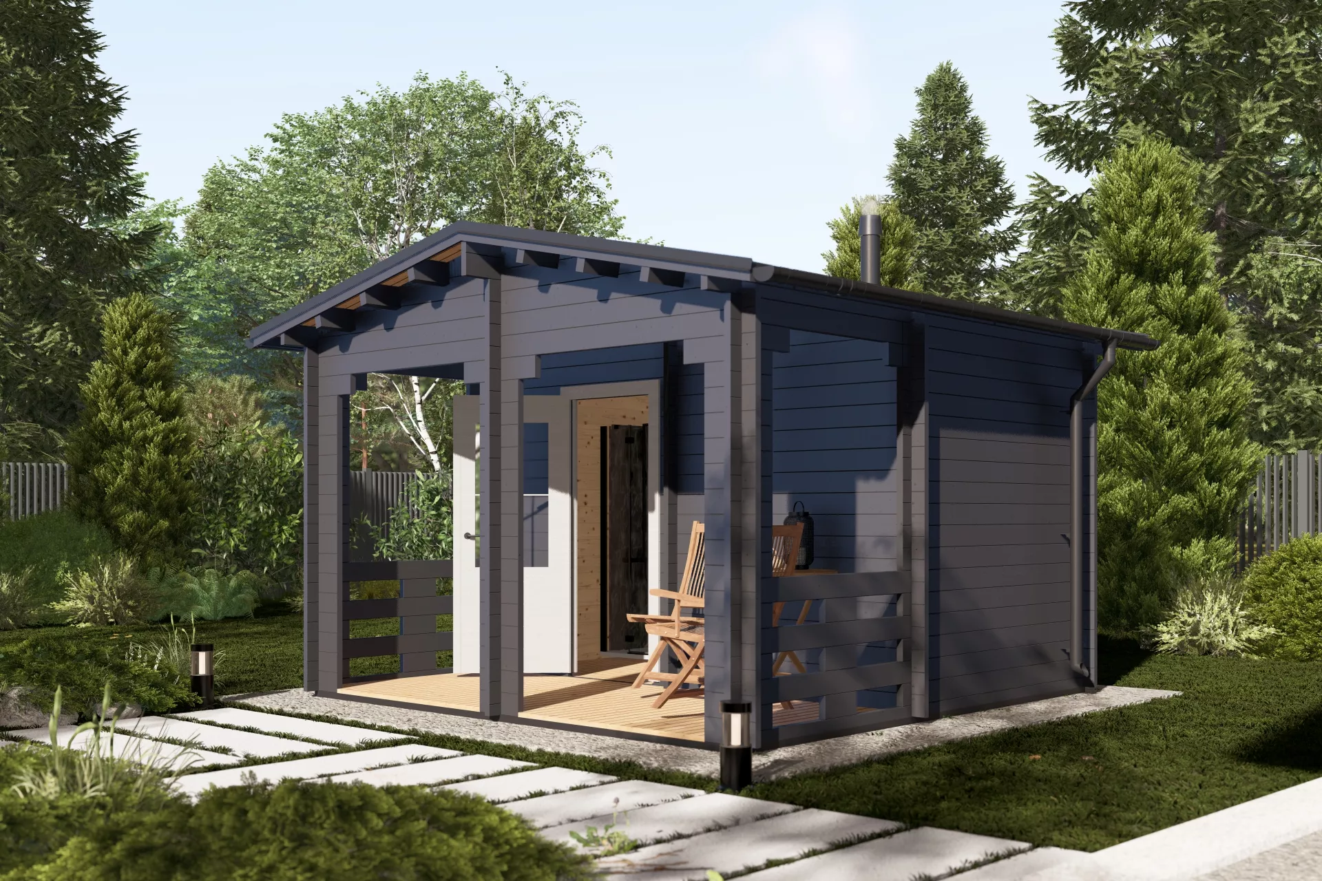 Одним из ярких примеров является компактная, но функциональная баня размером 4×4 м с удобной террасой, рассчитанная на комфортный отдых 2–4 человек. Эта планировка объединяет полноценное помещение для парной, комнату переодевания/отдыха и открытую зону на улице. Терраса идеально подходит для времяпрепровождения после парения — здесь можно разместить стол и кресла для размеренного отдыха и общения.